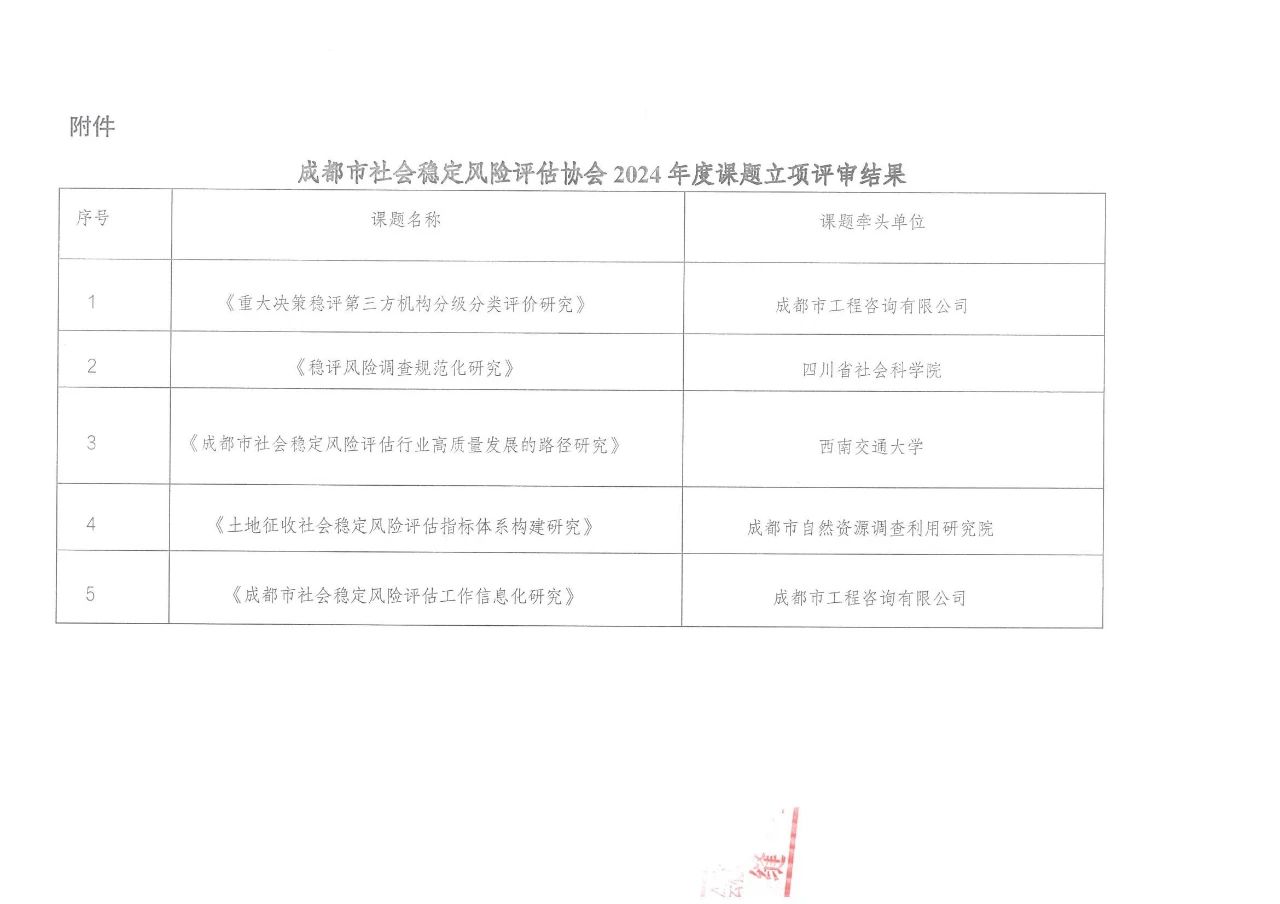 按照成都市社會(huì)穩(wěn)定風(fēng)險(xiǎn)評(píng)估協(xié)會(huì)《關(guān)于開展2024年度課題研究申報(bào)工作的通知》要求,經(jīng)會(huì)員單位申報(bào)和專家組評(píng)估,擬對(duì)《重大決策穩(wěn)評(píng)第三方機(jī)構(gòu)分級(jí)分類評(píng)價(jià)研究》等5個(gè)課題進(jìn)行立項(xiàng)。