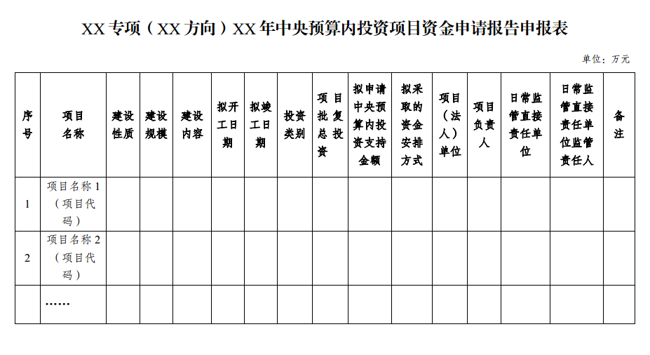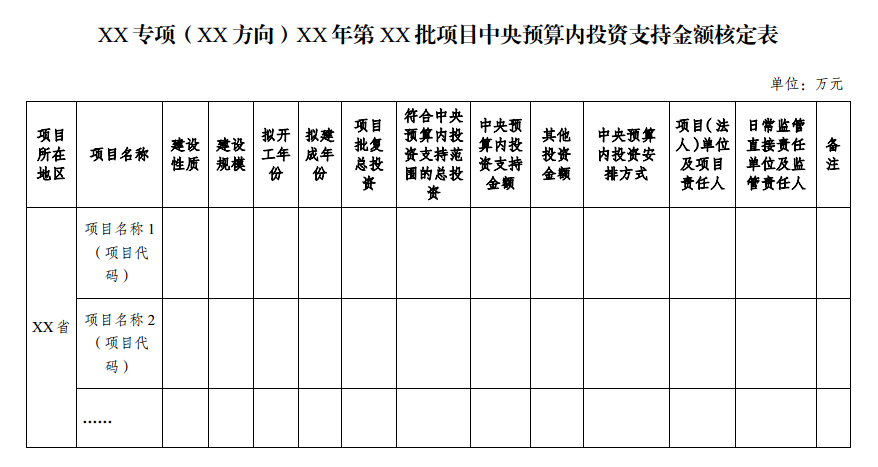 二、在附表中,應(yīng)當(dāng)明確每個項目的中央預(yù)算內(nèi)投資支持金額,并在“備注”欄中注明“本次批復(fù)資金申請報告”。